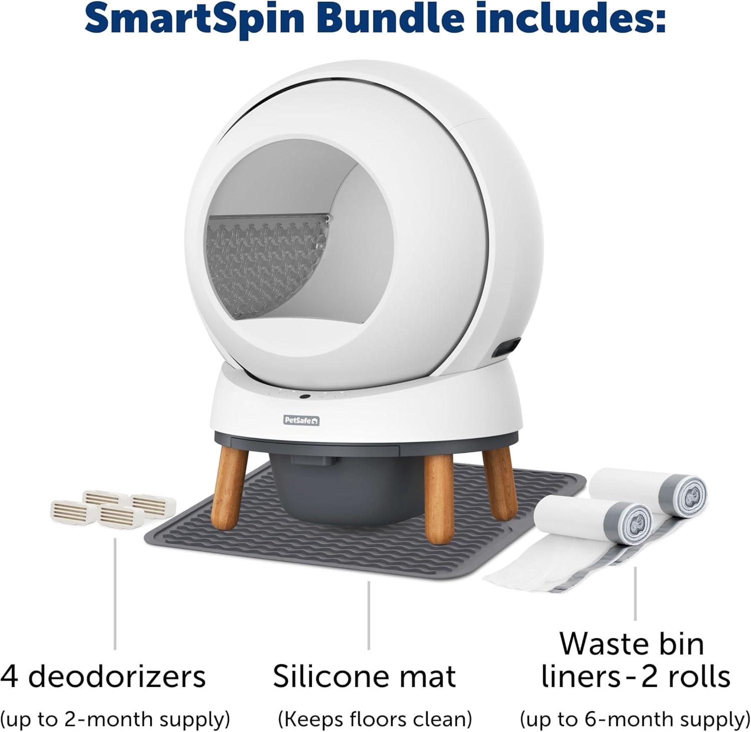 Level up your litter box and tap into your pets health with the ScoopFree SmartSpin Self-Cleaning Litter Box Bundle. SmartSpin sifts your cats clumps and waste into a sealed, deodorized waste bin giving you 4x better odor control vs. traditional litter boxes. The integrated app tracks your cat's weight and litter box usage, providing essential insights into their well-being, so you are always informed about their health. Automatic cleaning gives your cat a fresh bed of their favorite litter every time. Say goodbye to scooping forever and join the millions of pet parents worldwide living a life of ScoopFreedom today!
